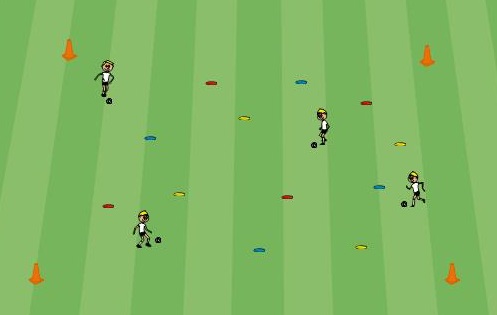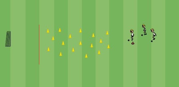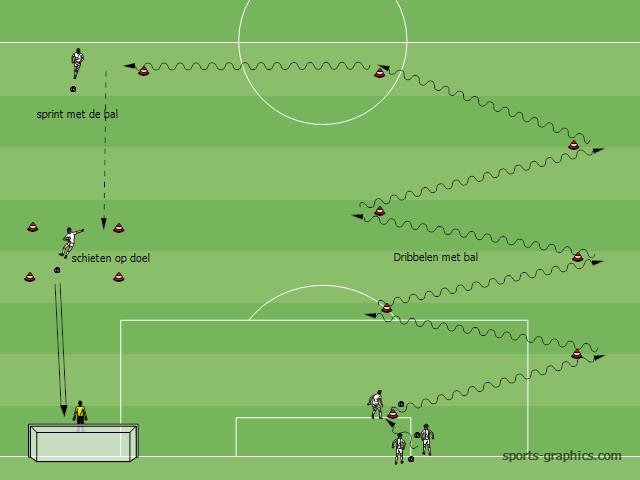 Op het einde dribbelen ze met de bal naar de overkant om vervolgens de oefening te herhalen.