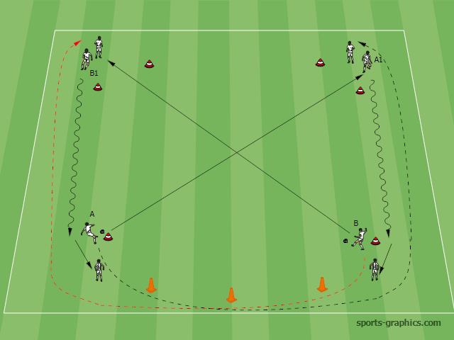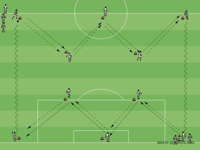 Spelers geven een pas naar de volgende kegel waar er een speler staat. Hierna lopen ze naar die positie. Waar ze de volgende pas afwachten.
